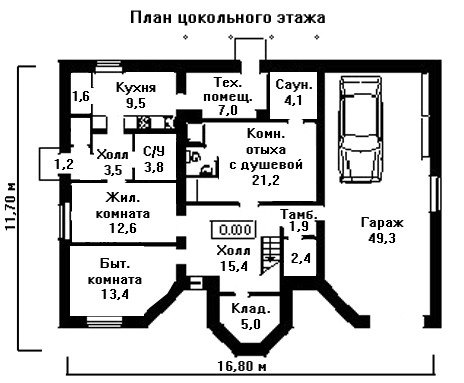 Большой трехуровневый дом станет истинным украшением городской коттеджной застройки. С виду этот коттедж выглядит надежным и немного напоминает крепость, хотя в общих чертах вполне соответствует традиционной современной архитектуре односемейных особняков. Подземное гаражное помещение рассчитано на два авто и имеет общую площадь 49,3 кв. м. Помимо банного блока, состоящего из сауны, санузла и комнаты для отдыха, в цоколе так же предусмотрена кухня, жилая и бытовая комнаты.
