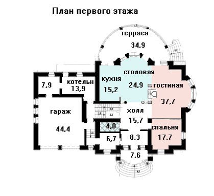 Прекрасный загородный особняк в четырех уровнях предлагает практичную компактную планировку и шикарные респектабельные фасады, которые одинаково выгодно будут выглядеть и в городе среди элитной коттеджной застройки, и на лоне природы в окружении большой частной земли. Крыльцо, оформленное в виде широкой арки, предваряет вход в дом. Столовая, кухня и гостиная объединены в одно общее пространство, так же практически не отделенное от территории холла. Отсюда можно выйти на большую полукруглую террасу за домом. Двухместный гараж пристроен к коттеджу справа и имеет площадь 44,4 кв. м. Несмотря на наличие котельной и кладовой на первом этаже, в проекте предусмотрен цокольный этаж, полностью принадлежащий помещениям технического назначения.