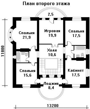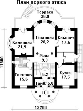 На первом этаже изюминкой планировки является каминная, выведенная в отдельное помещение размером 21,9 кв. м. Рядом с полукруглым эркером по одной из стен расположена гостиная, оборудованная выходом на округлую террасу.