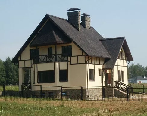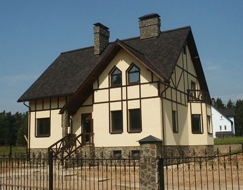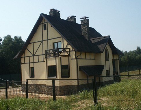 Загородный коттедж в стиле фахверк смотрится очень солидно, добротно и надёжно. Дом очень компактен и экономичен, его возведение возможно на участках небольшой площади.