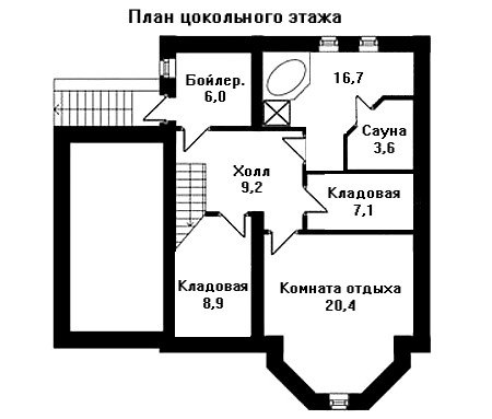 Первым этажом считается помещение цоколя, в котором разместились не только кладовые, но также и сауна с джакузи. Следует отметить, что со стороны левого крыла здания был создан встроенный закрытый гараж для одного семейного автомобиля.