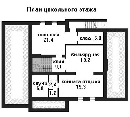 В особняке три этажа, включая цокольный, имеющий собственный вход со стороны приусадебного участка. На цокольном этаже размещены бильярдная, котельная, кладовая, а также банный блок из сауны, душа и помещения для отдыха. На территории первого этажа располагаются все комнаты для дневного пребывания членов семьи и гостей – это территория кухни, гостиная-столовая, комната для размещения гостей, санитарный узел и комната под гардероб. Из кухни и территории гостиной можно выйти на просторную крытую террасу. Гараж на две машины выполнен в виде пристройки к основному объёму дома. Мансарда представляет собой зону отдыха, которую представляют три спальни, ванная комната, гардероб и кладовая.