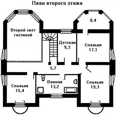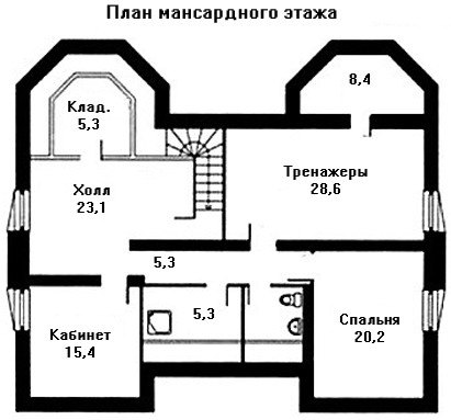 Три из четырех спален дома расположены на втором этаже, а четвертая находится на территории мансарды, где кроме нее отведено место под кабинет и тренажерный зал.