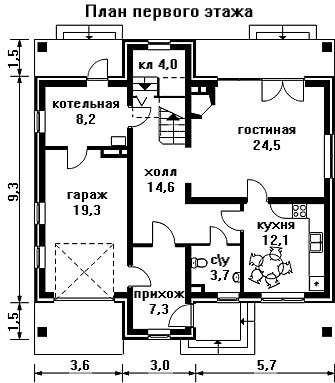 Внутренний объем дома имеет очень удобную и эффективную планировку, что позволяет создать высокий уровень комфорта для его обитателей. Встроенный гараж соседствует с котельной, в которую имеется отдельный вход со стороны участка. В центральной части первого этажа находится просторный холл, который связывает между собой все помещения зоны дневного пребывания – это кухня-столовая, санузел и просторная гостиная с угловым камином и витражным остеклением, из которой можно выйти на террасу.