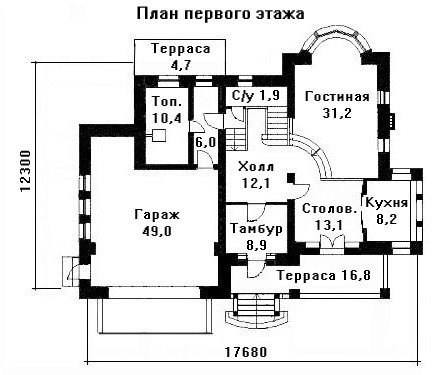 Планировка внутреннего пространства особняка решена очень рационально и эффективно для обеспечения максимально возможного уровня комфорта и удобства. Главный вход в дом выполнен с небольшой крытой террасы через тамбур, за которым следует просторный холл. Первый этаж выполнен в двух уровнях. На нижнем уровне находятся кухня, территория столовой, котельная и встроенное помещение гаража, на высоком уровне располагается просторнейшая гостиная с эркером, открывающим прекрасный вид в сад.
