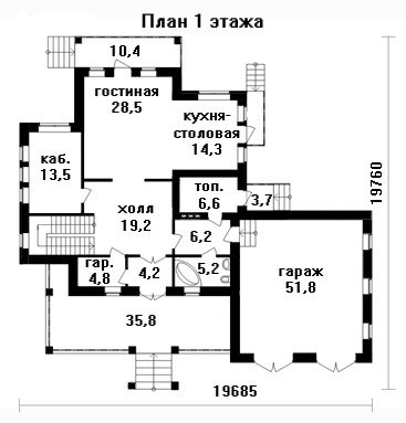За тамбуром открывается просторный холл с лестницей на территорию второго этажа. Из холла прямо через арочный проём попадаем в общую территорию кухни-гостиной-столовой. Из гостиной и кухни возможно выйти на небольшие террасы и спуститься на участок. Кроме того на первом этаже располагаются кабинет, котельная, оборудованная отдельным выходом на участок, и гараж на две автомашины, выполненный в виде пристройки к основному объёму здания.