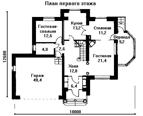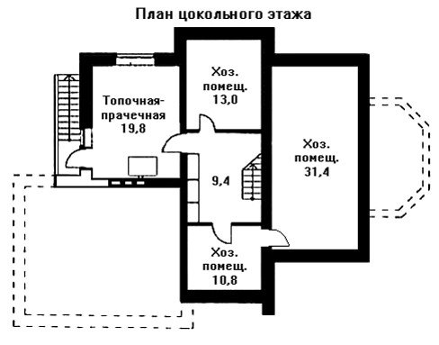 Цокольный этаж дома заполнен техническими и хозяйственными помещениями для обеспечения нормальной жизнедеятельности особняка. В котельную имеется отдельный вход со стороны участка. На первом этаже дома находятся просторный холл, гостиная с камином, столовая и кухня, связанные между собой по анфиладной схеме. Из помещения столовой можно выйти на остеклённую веранду и спуститься затем на участок. В левой части дома расположены гараж на две машины и гостевая спальня с санузлом.