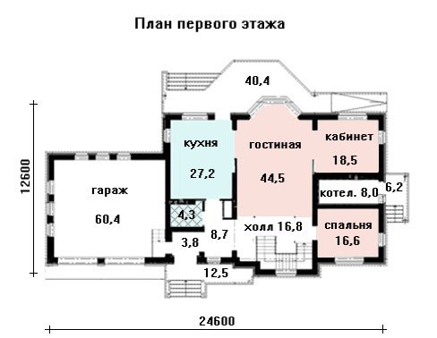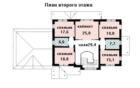 Приятным удобством в предлагаемом проекте можно считать просторный пристроенный слева гараж на два автомобиля, который, впрочем, можно исключить из проекта при необходимости размещения особняка на более мелком земельном участке. Кухня, кабинет, гостиная и одна из спален расположены на первом этаже. Второй же этаж почти полностью принадлежит спальной зоне и состоит из четырех спален и небольшого кабинета.