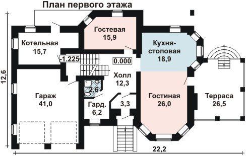 Украшением гостиной комнаты, расположенной на первом этаже, служит грациозный многогранный эркер по одной из ее стен. При площади в 26 кв. м. гостиная комната расширена совмещенной с ней кухне-столовой, которая так же может похвастаться эркером по другой из внешних стен.