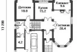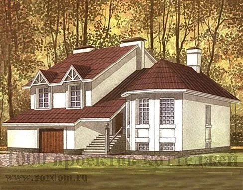 Добротный загородный коттедж, конструктивная особенность которого состоит в том, что он выполнен из двух объёмов с раздельными крышами. Малый объём – это просторная двусветная гостиная с высоким сводом и оборудованная большим камином, в дальней части этой пристройки находится небольшой кабинет для уединения и творчества, из которого можно выйти на террасу и спуститься в сад.