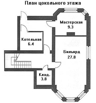 Больший объём заполняют все остальные жизненно важные для проживания небольшой семьи помещения. Он имеет три этажа, включая цокольный, который приспособлен для технических нужд и отдыха – там находится зал для бильярда.