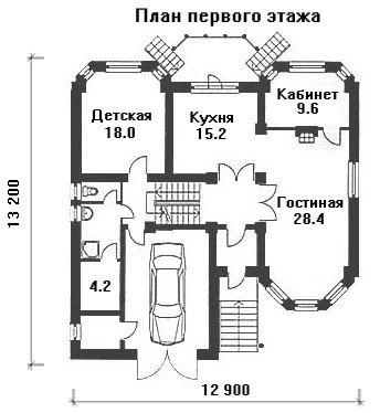 На первом этаже расположен встроенный гараж, целый ряд хозяйственный помещения, ванная, игровая детская комната с выходом в сад и кухня.