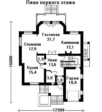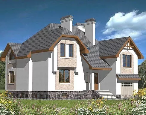Удобный закрытый гараж для одного автомобиля расположен с фронтальной стороны дома. Здесь же находится небольшое крыльцо с рядом ступеней. Кухня, столовая, гостиная и каминная комнаты не разделены перегородками и стенами, а гармонично переходят друг в друга.