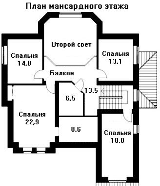 Украшением второго этажа является помещение второго света. Кроме того, планировкой дома предусмотрены 5 спальных комнат.