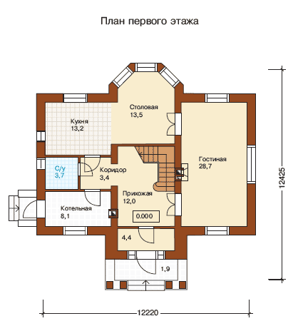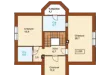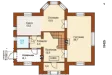 В гостиной, занимающей треть первого этажа, расположен камин. В этой комнате предусмотрено два входа: один из прихожей дома, а второй с территории столовой, частично расположенной в изящном многогранном эркере. «Хозяйская» спальня, размещенная над гостиной, имеет площадь 28,7 кв. м. и оборудована собственным санитарным узлом. Напротив нее находятся еще две спальни поменьше.