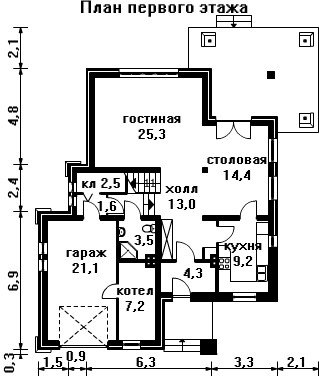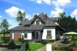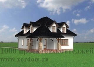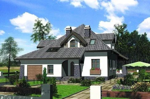 Современный загородный особняк отличают оригинальное объёмное планировочное решение, выразительная многоскатная кровля с вертикальными «слуховыми» окнами, изысканный декор фасада в виде стилизованных колонн по углам здания. Такими же колоннами, но уже не стилизованными, а настоящими, оформлен главный вход в дом и небольшая крытая терраса. Дом предназначен для постоянного проживания небольшой семьи в составе 3-5 человек.