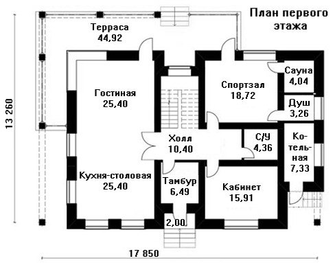 Внутренняя планировка дома предусматривает все необходимые для комфортного проживания помещения. Традиционный комплект помещений для зоны дневного пребывания дополнился в этом коттедже двумя дополнительными пунктами – сауной и тренажёрным залом.
