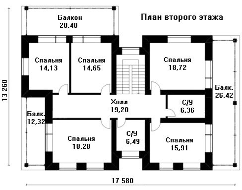 Пространство мансардного этажа дружно делят между собой пять разновеликих по площади спален и два санузла. Все спальни оснащены выходами на балкон.