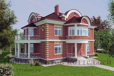 Просторный коттедж, оформленный в классическом стиле с современными элементами дизайна, подойдет для постоянного проживания средней по численности семьи, привыкшей к городским комфортабельным условиям. Выступающие двухэтажные эркеры, полукруглое крыльцо у парадного входа в дом и округлые элементы крыши подчеркивают тонкий стиль и изящество этого кирпичного особняка.