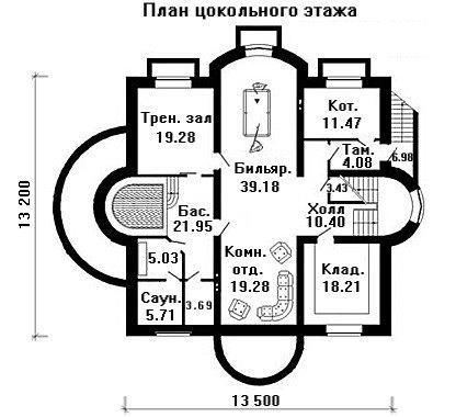 Полноценный цокольный этаж разделен на две основные зоны. К первой, наименьшей, относятся помещения хозяйственного назначения, а ко второй – развлекательно-оздоровительный блок. Тут расположены бильярдная с комнатой отдыха, тренажерный зал, сауна и бассейн.
