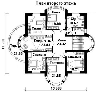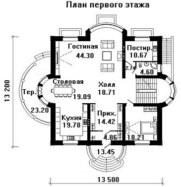 Украшение первого этажа является просторнейшая гостиная, совмещенная со столовой. Обе территории имеют полукруглые эркеры, придающие интерьеру изящество и индивидуальность при оформлении. В коттедже пять спальных комнат, при этом четыре расположены на втором этаже, а одна на первом.