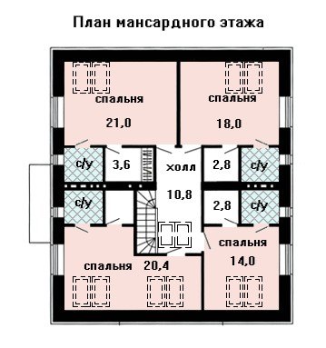 Пространство мансардного этажа поделено между четырьмя спальнями, которые оборудованы персональными санузлами и гардеробными комнатами.