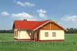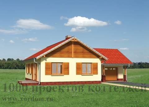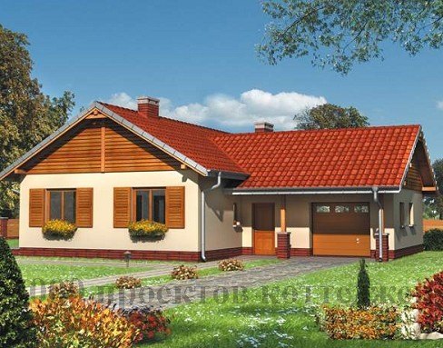 Гараж для одной автомашины выполнен как пристройка к основному объёму здания, в которой кроме места для авто предусмотрено помещение прачечной или котельной.