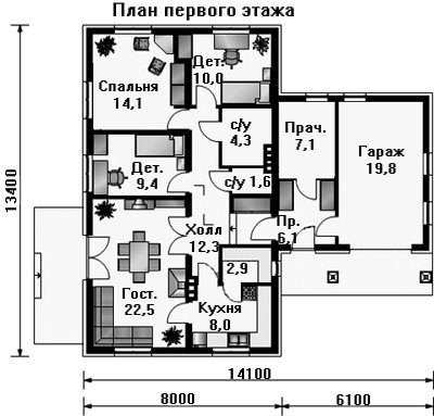 Традиционное зонирование внутреннего пространство в домах такого стиля в этом проекте неукоснительно соблюдается. Гостевая зона разделена с приват-зоной небольшим пространством холла, из которого можно попасть во все помещения дома. Большая гостиная, оборудованная настоящим камином, имеет выход на открытую террасу. В гостиной также отведено место для столовой, так как отдельной столовой проектом не предусмотрено.