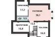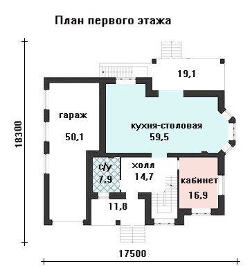 Так же в доме предусмотрен довольно большой, 50,1 кв. м., гараж на два авто. Почти всю территорию первого этажа занимает просторная кухня-столовая размером 59,5 кв. м., украшенная небольшим многогранным эркером по одной из внешних стен. Отсюда можно пройти на территорию придомовой террасы. Тут же на этаже размещен рабочий кабинет площадью 16,9 кв. м.