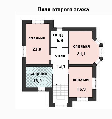 Так же в доме запроектированы три спальные комнаты, находящиеся на втором этаже и имеющие один общий санузел и гардеробную комнату.