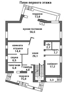 Современный загородный особняк со стильными скошенными террасами придется по вкусу семье, привыкшей к городскому комфорту. Данный проект универсален и предназначен для воплощения и в городе и в сельской местности. Коттедж оснащен просторнейшей гостиной комнатой с камином, так же образующей единое пространство с территорией кухни. Банный комплекс, предусмотренный в левой части первого этажа, делится между сауной и комнатой отдыха размером 14,4 кв. м. Справа от холла запроектировано помещение под рабочий кабинет площадью 17,2 кв. м.