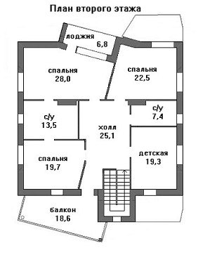 Три спальни и детская комната находятся на втором этаже и размещены вокруг просторного общего холла площадью 25,1 кв. м. В «хозяйской» спальне предусмотрен отдельный большой санузел размером 13,5 кв. м., а так же персональный балкон. Кроме того на этаже дополнительно оборудован еще один более просторный балкон, попасть на который можно из холла.