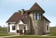 Небольшой особняк с двумя этажами и винтовой лестницей имеет площадь 178,87 кв. м. Дизайн фасадов коттеджа имеет запоминающийся вид и сочетает в себе традиционность современных тенденций в оформлении коттеджей с элементами замкового стиля. Главным украшением экстерьера дома является высокая, во всю его высоту, округлая башня-эркер, завершающаяся обособленной остроконечной крышей. Парадный вход в дом имеет в преддверии небольшое крытое крыльцо.