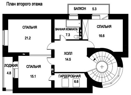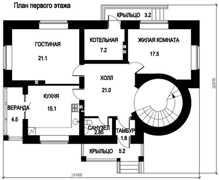 Помещение кухни на первом этаже имеет персональную веранду размером 4,5 кв. м. Большая квадратной формы гостиная комната является наибольшим помещением этажа и граничит с котельной, вход в которую осуществляется с крыльца за домом. Тут же на этаже находится жилая комната свободного назначения. Во все помещения первого этажа можно попасть из общего просторного холла площадью 21 кв. м. По расположенной в круглом эркере винтовой лестнице можно попасть на территорию второго этажа, где находятся три спальни.