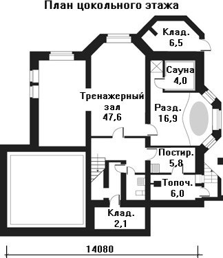 Два гаража, расположенные в левой части коттеджа, для дополнительного удобства имеют отдельные въезды и занимают площадь 31,8 кв. м. В цоколе находится большой тренажерный зал и банный блок с небольшим бассейном в помещении раздевалки. Все хозяйственные помещения по проекту предусмотрены на территории цоколя.