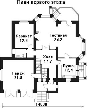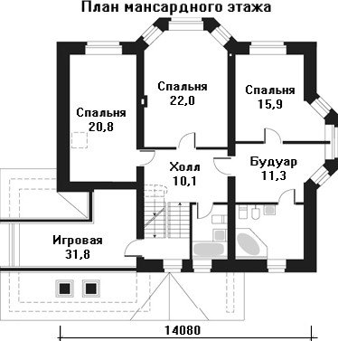 Украшением первого этажа является необычной формы гостиная с камином и выходом на придомовую террасу. Второй этаж представляет интерес наличием помимо трех спальных комнат небольшого будуара и территории под игровую комнату.