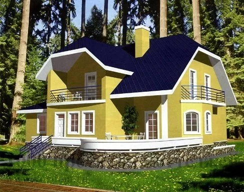 Пристройка-гараж выполнена одноэтажной, потому мансардный этаж много меньше по площади, чем первый. На нем располагаются три спальни, ванная комната, санузел. Одна из спален имеет выход на балкон, а другая оборудована персональным гардеробом.