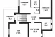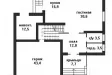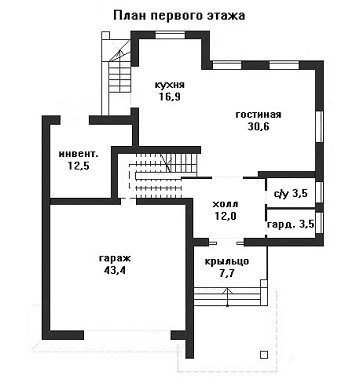 Гараж, предусмотренный проектом на первом этаже, предназначен для размещения двух авто и предлагает площадь 43,4 кв. м. Кухня и гостиная, занимающие практически все оставшееся на первом этаже пространство, полностью совмещены друг с другом и занимают территорию в 16,9 кв. м. и 30,6 кв. м.