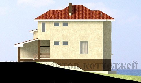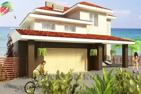 Теплый дизайн и минималистический современный стиль этого коттеджа навевают морское настроение и заставляют задуматься об отпуске. Такой дом отлично подойдет для воплощения за городской чертой, желательно вблизи водоемов. Простой по своим формам он достаточно непритязателен в постройке. В коттедже подразумевается наличие полноценного цокольного этажа с большим тренажерным спортзалом, сауной и комнатой для отдыха. Здесь прекрасно можно проводить время в большой дружной компании, устроившись на длительный срок для совместного отдыха.