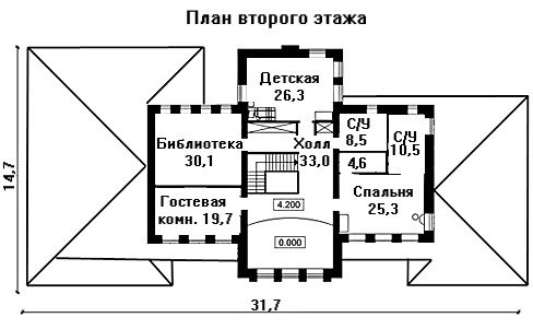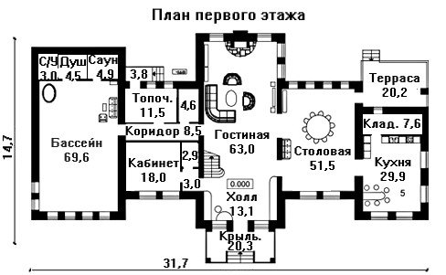 Проектом предусмотрено на первом этаже размещение стандартного набора жилых и подсобных помещений. Это гостиная комната площадью 63 кв. м. с лестницей на второй этаж, а так же кабинет, кухня и столовая. Здесь же на этаже расположен просторный бассейн с сауной и санитарной частью. Второй этаж разделен между четырьмя комнатами – детской, спальней, кабинетом и комнатой для гостей.