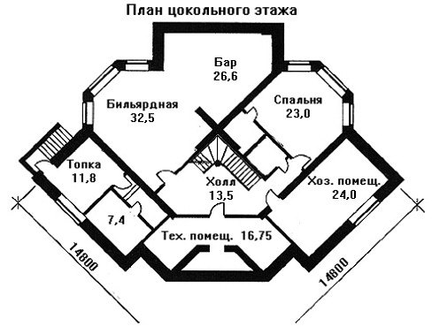 Внутренняя территория коттеджа использована максимально функционально. Зона активного отдыха для семьи и гостей организована на территории цокольного этажа, где находится бильярдный зал с баром, а так же одна из спален коттеджа. Все помещения для дневного пребывания первого этажа размещены вокруг ромбовидного холла с лестницей. Среди них столовая с кухней и гостиная комната. Так же тут предусмотрена одна из спален с собственным санузлом.