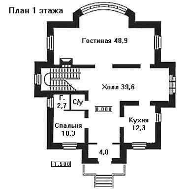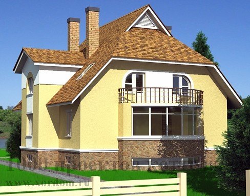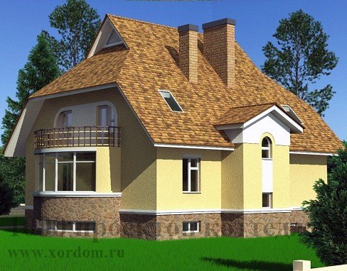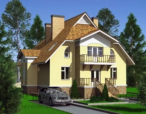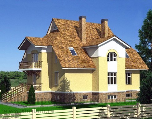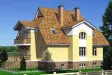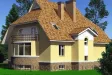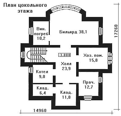 Этот особняк для проживания одной семьи рассчитан на постройку в краях с температурой минус 30 в зимнее время. Приятный внешний облик достигнут за счет ровных линий светлых фасадов и небольших дизайнерских акцентов в виде полуарочных окон, округлого эркера и многоуровневой кровли. Цокольный этаж по проекту является полноценной жилой частью особняка и предлагает размещение таких комнат, как бильярдный зал с площадью 38,1 кв. м., а так же винного погреба размером 10,2 кв. м. Тут же расположены вспомогательные хозяйственные помещения.