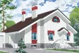 Внутренняя планировка дома очень рациональна и эффективна, с высоким процентом использования полезной площади. Главный вход в дом выполнен через тамбур, после которого попадаем в небольшой холл, а из него – во все остальные помещения этажа. В передней части дома сгруппированы помещения кухни, двух спален, ванной комнаты и санузла. В задней части находятся ещё одна спальня и просторная гостиная с камином. Из холла имеется выход на небольшую террасу, обращённую в сад.
