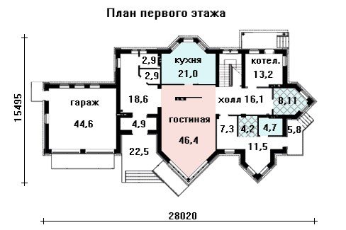 Этот проект респектабельного загородного коттеджа со всеми удобствами предназначен для воплощения на достаточно большом участке земли с длиной по одной стороне 28 м, и 15,5 м по другой. Это яркий запоминающийся проект привлекающий внимание лаконичными фасадами, украшенными оригинальными дизайнерскими элементами такими, как полностью остекленный треугольный эркер в высоту всего особняка, а так же несколько многогранных эркеров по периметру всего коттеджа.