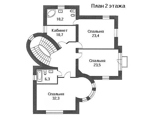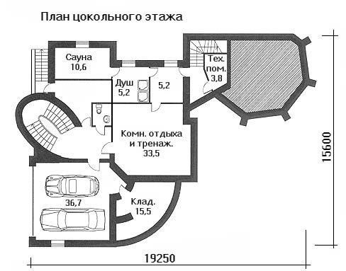 На втором этаже расположен маленький кабинет всего 10,2 кв. м. и три спальни, одна из которых имеет изящный круглый эркер по одной стене. Помимо этого набора жилых помещений в проекте предусмотрен двухместный гараж, расположенный в цоколе, где так же находится тренажерный зал, кладовая и небольшой банный блок.