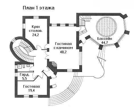 Уникальный по своей форме и внешнему оформлению загородный коттедж предназначен для постоянной комфортабельной жизни в нем средней по численности семьи. В этом проекте практически все элементы, начиная от отделки фасадов, и заканчивая внутренним декором. Так, лестница, соединяющая первый и второй этажи, имеет форму овала, а многогранный эркер, в котором расположен бассейн, выглядит очень оригинально. Помимо бассейна на первом этаже находится гостиная с камином общей площадью 48,2 кв. м., а так же кухня-столовая и комната для размещения гостей.