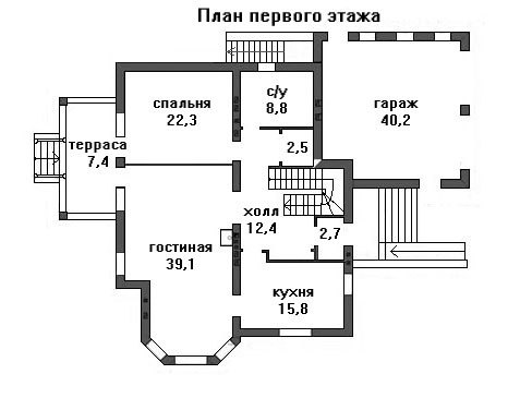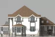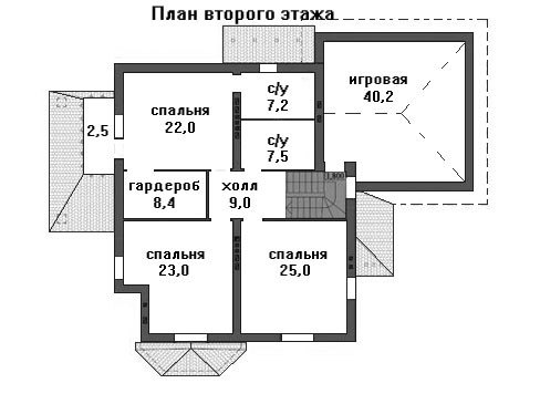 Первый этаж предлагает стандартный набор жилых комнат. В первую очередь это гостиная площадью 39,1 кв. м., украшенная эркером по одной из внешних стен. Из нее, как и из соседней спальни, можно попасть на придомовую террасу. Второй этаж это зона для ночного отдыха с тремя спальнями, так же имеющая в своей планировке довольно большое помещение под игровую комнату размером 40,2 кв. м., которая так же превосходно подойдет и для размещения, например, бильярдного зала.