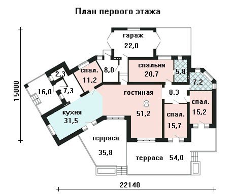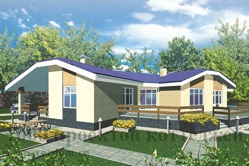 Оригинальный загородный коттедж в стиле ранчо для любителей одноэтажного жилья. Планировочное решение дома предполагает традиционное зонирование пространства на зону отдыха и зону дневного пребывания, которая организована плавным перетеканием помещения кухни в пространство внушительного размера гостиной с непременным романтическим атрибутом – камином в центре помещения.