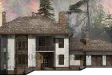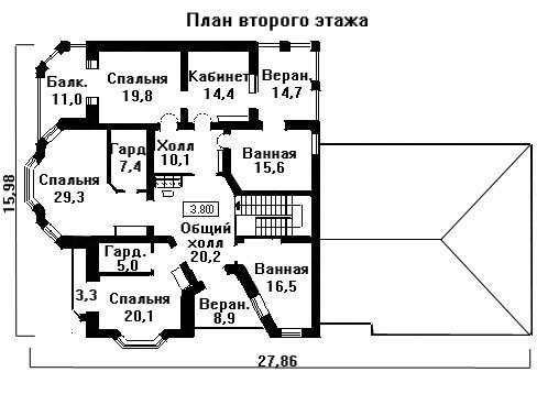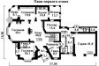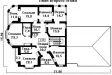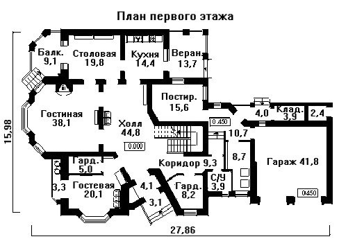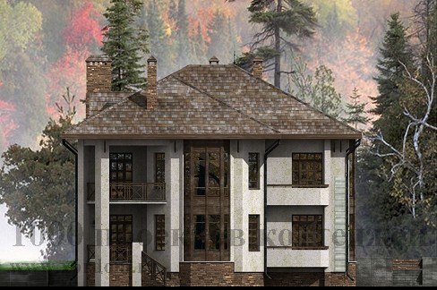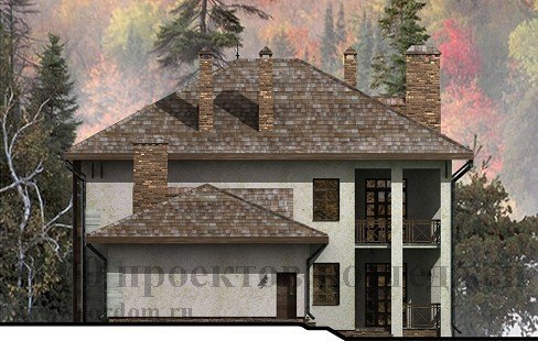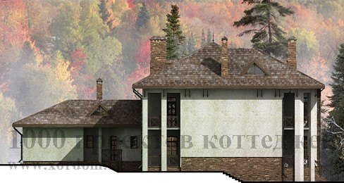 Просторный дом из кирпича в двух уровнях с отделкой штукатуркой и отделочным кирпичом. Проект интересен тем, что подходит для воплощения на земельных участках с понижением уровня в левой части. Цоколь в особняке отсутствует, поэтому все хозяйственные помещения компактно размещены на первом этаже, что нисколько не мешает довольно гармоничной и удобной его планировке. Помещение постирочной имеет площадь 15,6 кв. м. и находится слева от лестницы на второй этаж, при этом образуя одной из стен просторный холл. Гостиная комната расположена на территории 38,1 кв. м. и может похвастаться не только наличием уютного камина, но и своей необычной формой, чем обязана немного выступающему эркеру по внешней стене. Из помещения кухни можно пройти на террасу, а из расположенной рядом столовой выйти на балкон.