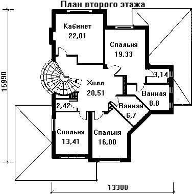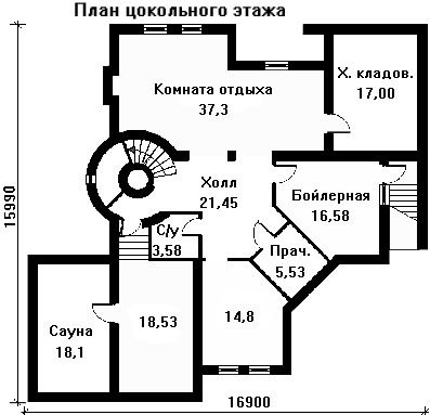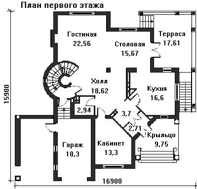 В доме есть цоколь, где находится сауна с санузлом и несколько технических и хозяйственных помещений. Винтовая лестница, размещенная в холле, украшает общий интерьер и ведет на последующие этажи. Весь первый этаж принадлежит стандартному набору жилых помещений. Это гостиная комната, оснащенная камином, рабочий кабинет, территория кухни и столовая с выходом на придомовую крытую террасу.
